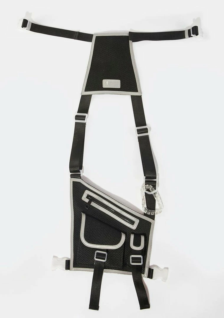 because you’re not interested in fitting in. This body harness has contrast colored reflective trim all over, pockets in the front, adjustable canvas straps, and clear plastic hardware.