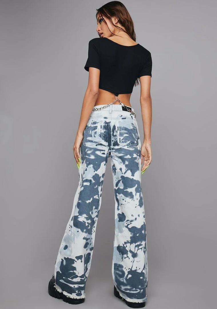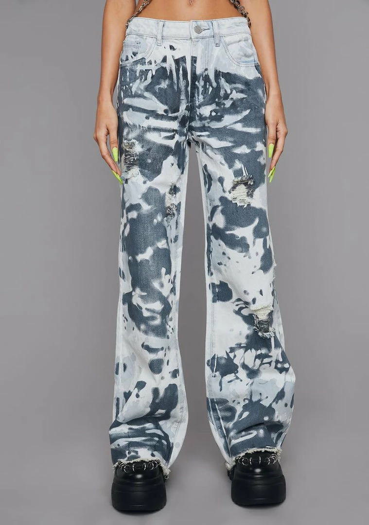 cuz you’re so clean when you pull up to the scene! These dyed and distressed denim jeans have a mid-rise fit, front and back pockets, baggy legs, raw cut hems, and a zip-fly closure.