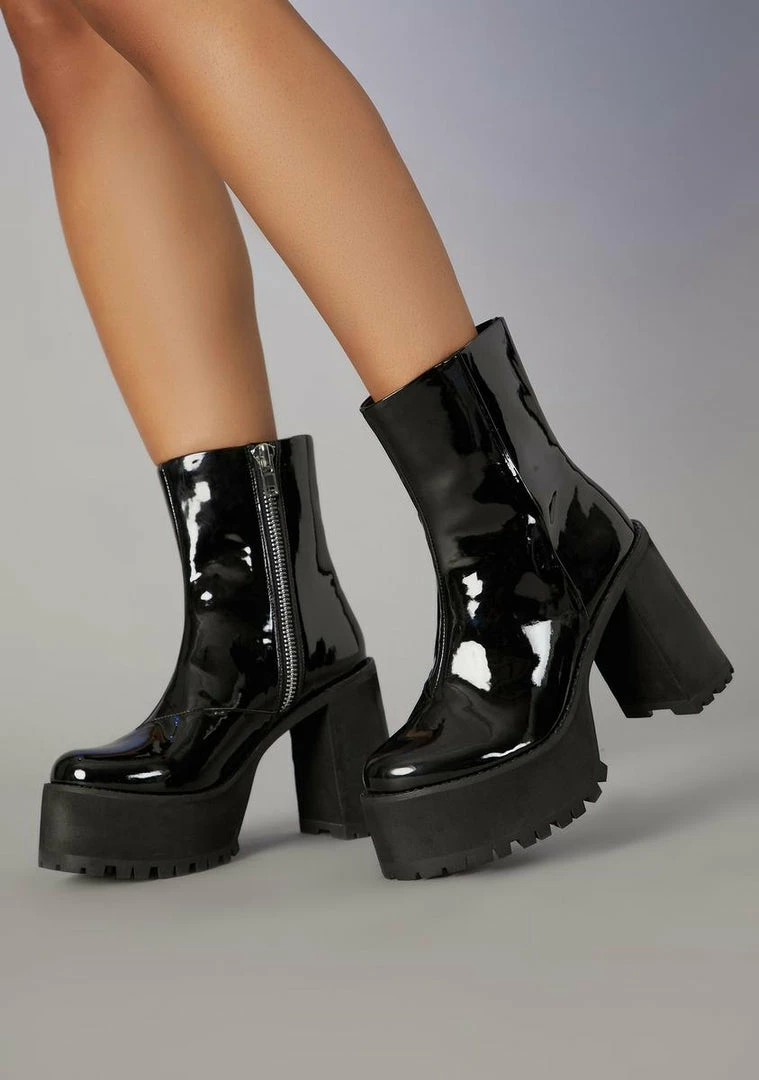 cuz the world is your runway. These platform ankle boots have a patent vegan leather construction, chunky block heels and side zip closures.