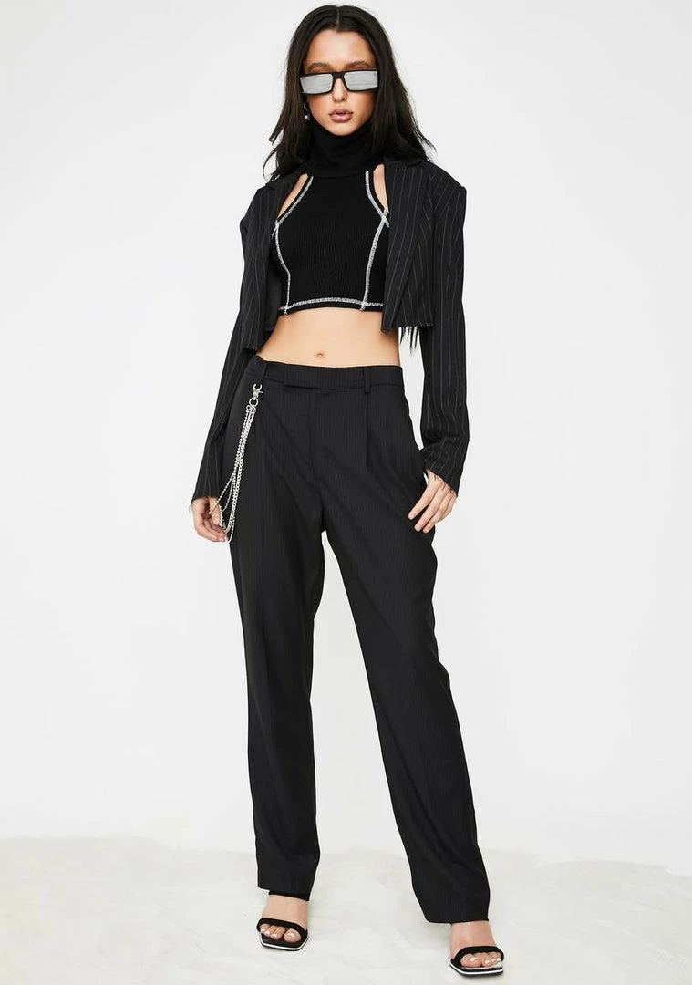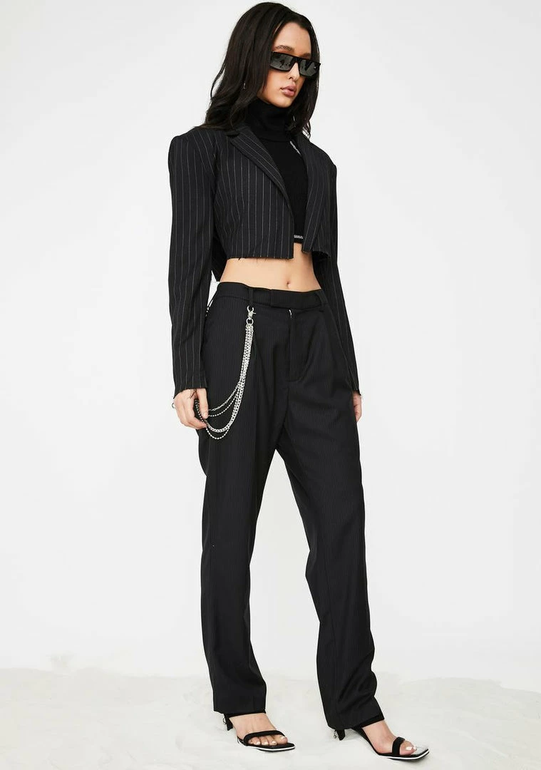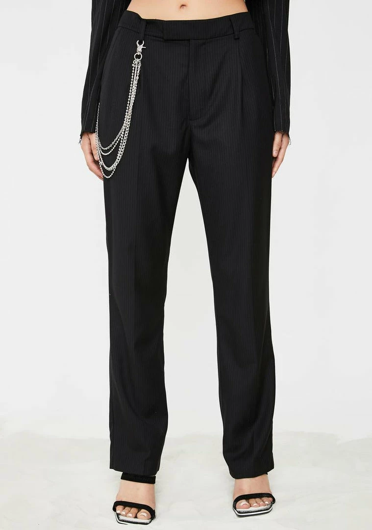 cuz you get paid to slay, sis! Stay booked Nâ busy in these boss bish pinstripe suit trousers that have a loose fit, hook Nâ bar zip closure and come with a baddie chain.