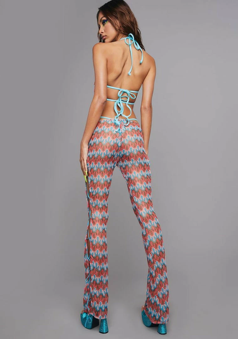 cuz you want that glam tan! This three-piece swim set has a crochet halter top with tie back straps, solid colored thong bikini bottoms, and sheer cover up pants with flared legs and side lace-up details.