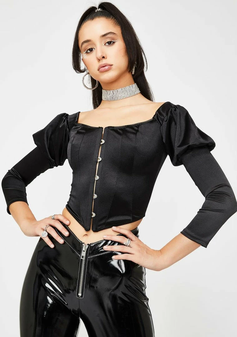 cuz yer a masterpiece and theyâre a tragedy! Theyâre not worth yer fuxxinâ time, so throw on this classy long sleeve crop top that has a corset torso with hook Nâ eye closures, smooth satin construction, puffy sleeves, and a square off the shoulder neckline.