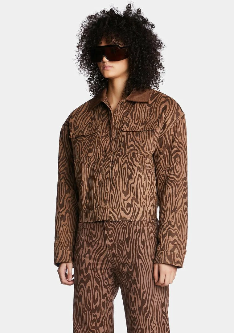 reality is merely an illusion. This long sleeve jacket has a psychedelic swirled wood grain printed all over, a corduroy collar, buttoned chest flap pockets, side pockets, and interior padding.