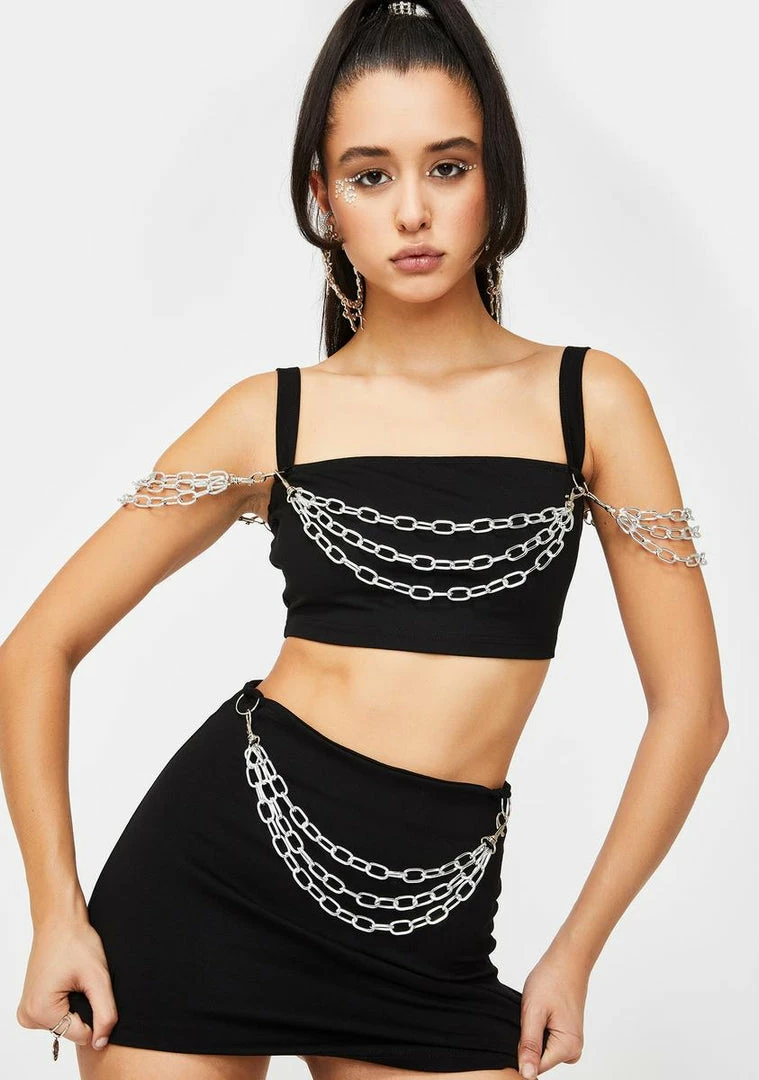 cuz you like to have yer cake Nâ eat it too! Finish âem like Mortal Kombat in this saucy cropped tank top thatâs drippinâ in detachable chains and has adjustable cami straps, a low square neckline and a back zip closure with an O-ring pull.
