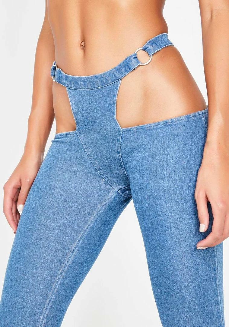 cuz ya fashion always makes a statement! Take a stand in style with these denim pants that have flared bottoms Nâ a g-string cut-out on the hips with O-ring hardware.