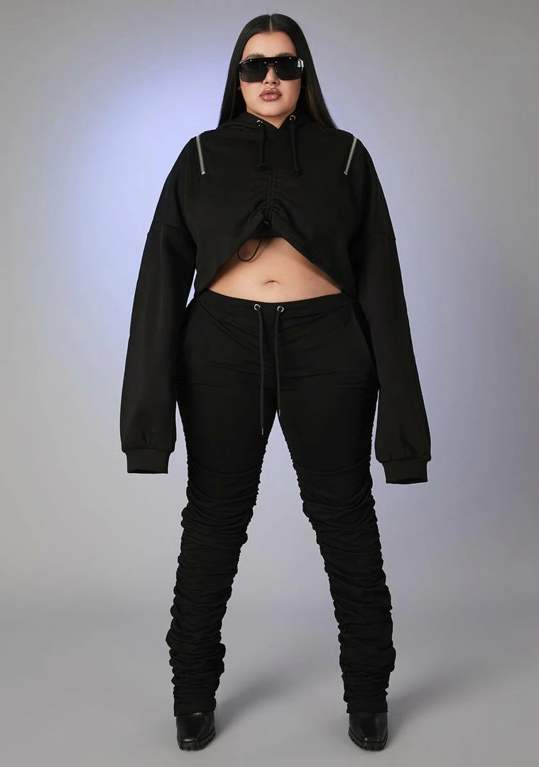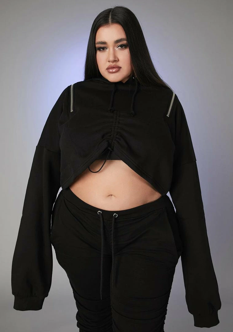 cuz you’re always changing. This hoodie has zipper detailing with a ruched drawstring front and cropped fit.