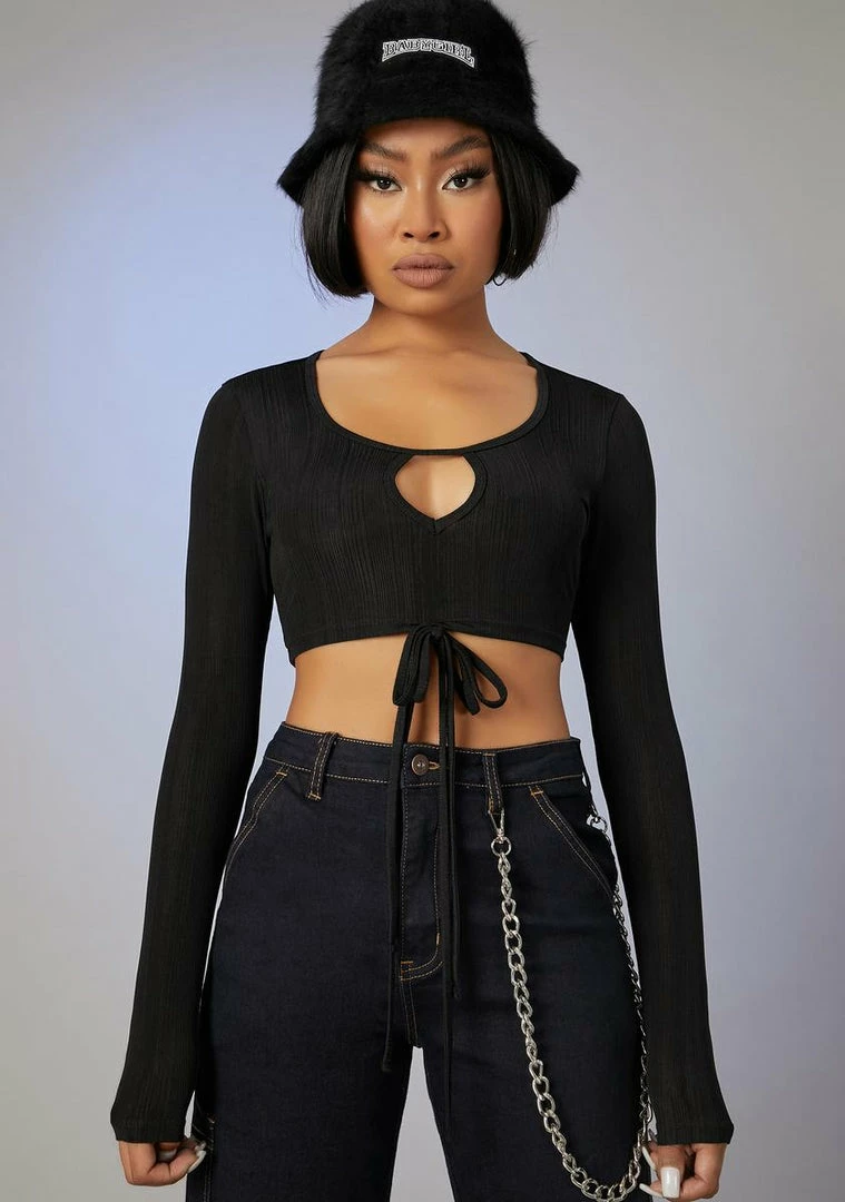 because they see right through you. This long sleeve crop top has a tie front and a keyhole cut-out design.