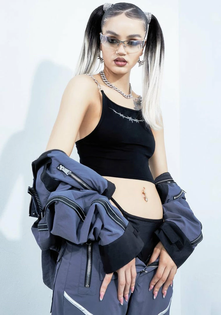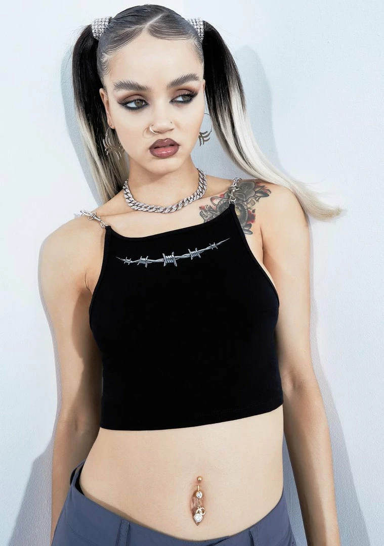 but you wanna guard your heart. This tank top has a cropped fit, adjustable shoulder straps with chain details, and a barbed wire graphic on the front.
