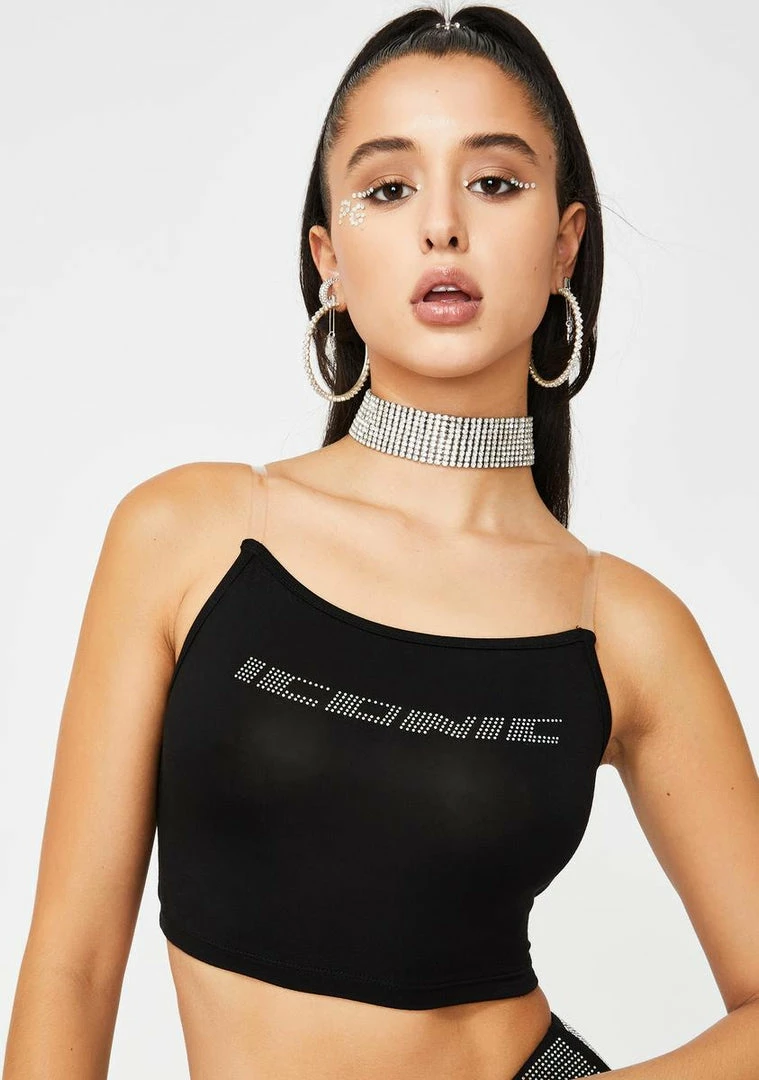 will have ya teaching âem to stay in their lane! Youâll be posted up in yer penthouse countinâ stacks on stacks in this blinginâ cami tank top that has a flirty cropped fit, iconic rhinestone script on the front, and clear adjustable straps.