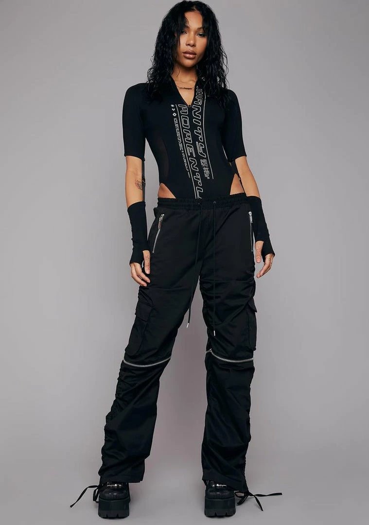 because there’s always room for one more. Go forever in this mock neck bodysuit with a front zipper, cutout strappy sleeves with thumb holes, mesh side panels, and “infinity momentum” printed on the front.