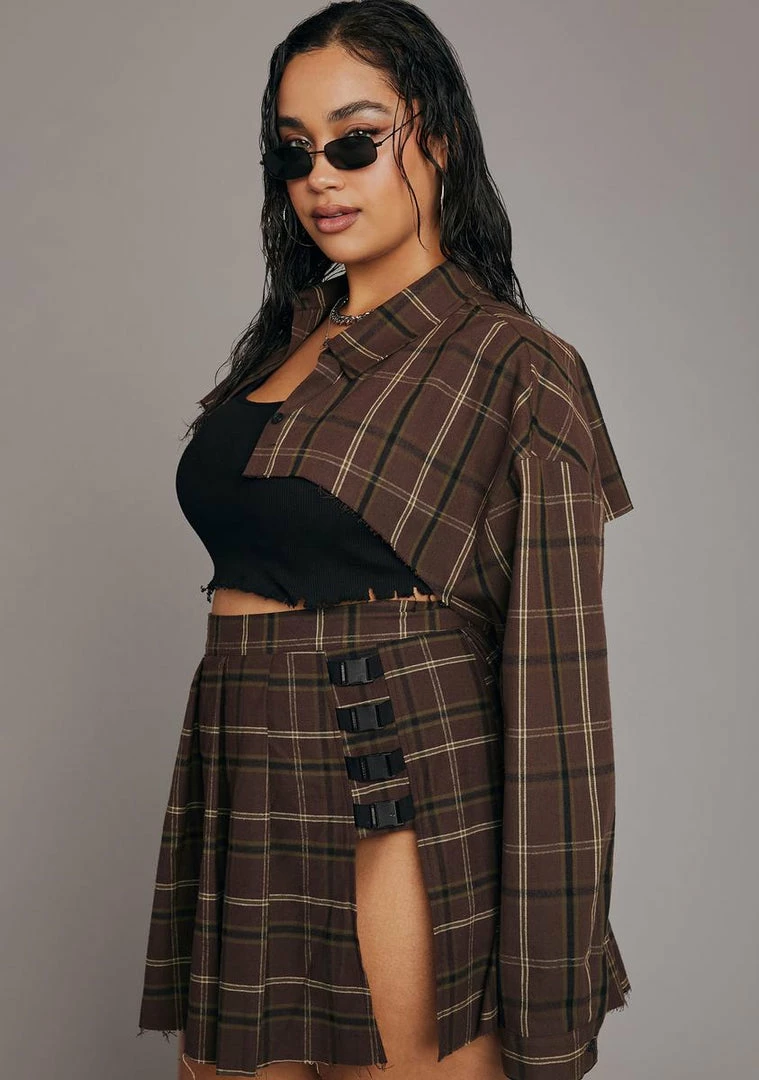 she can be the strong silent type. Play it up in this super cropped shirt with a collar, long sleeves, buttons up the front, and a plaid pattern.