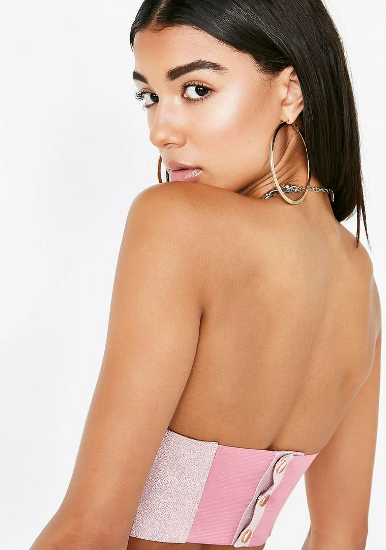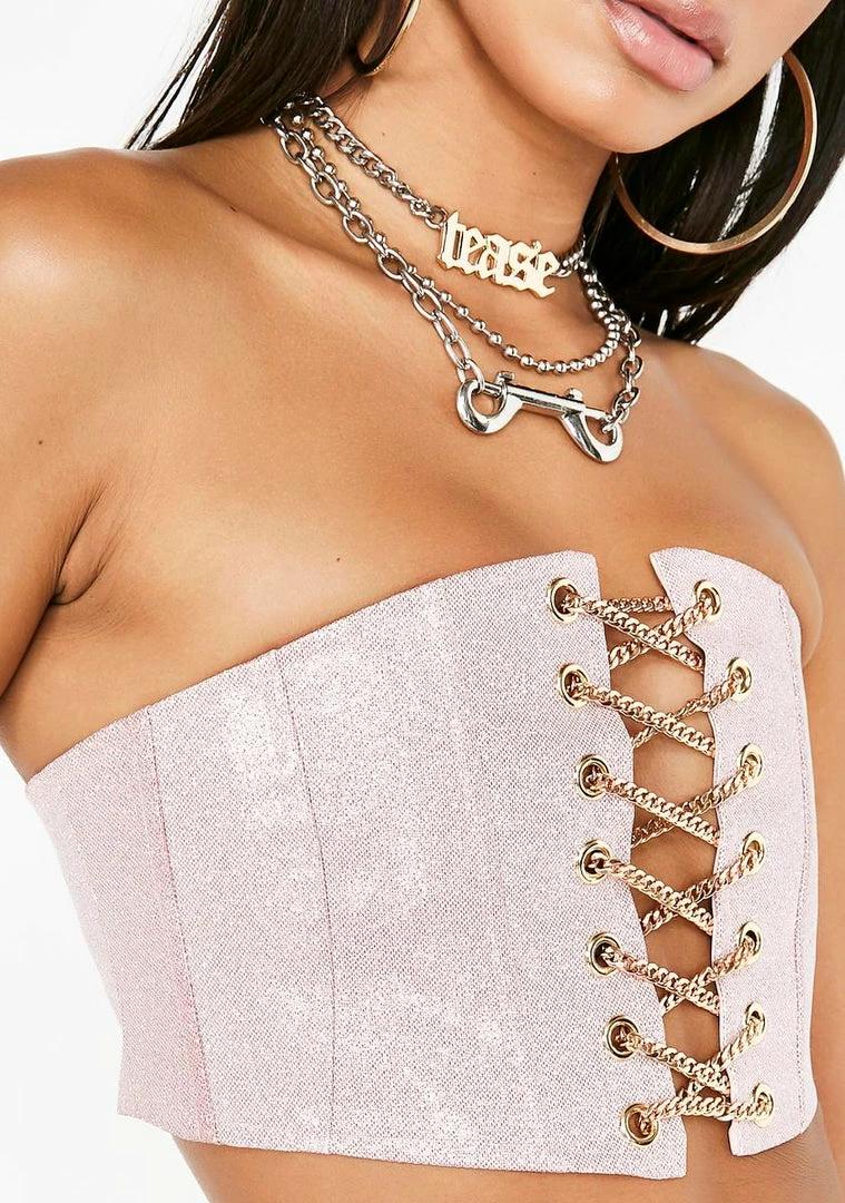 cuz youâre the number one stunna babe! Stay internationally known in this sassy glitter corset top that has gold-chain lace up deetz on the front, a back zip closure Nâ can be worn around the waist as a corset.