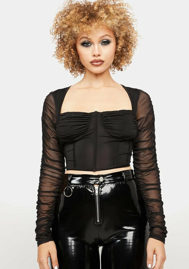 for those wintry nights. This corset top has an underwire bust and ruching details, sheer ruched long sleeves, a square neckline, and a cropped fit.