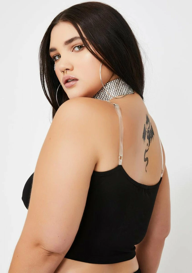 will have ya teaching âem to stay in their lane! Youâll be posted up in yer penthouse countinâ stacks on stacks in this blinginâ cami tank top that has a flirty cropped fit, iconic rhinestone script on the front, and clear adjustable straps.
