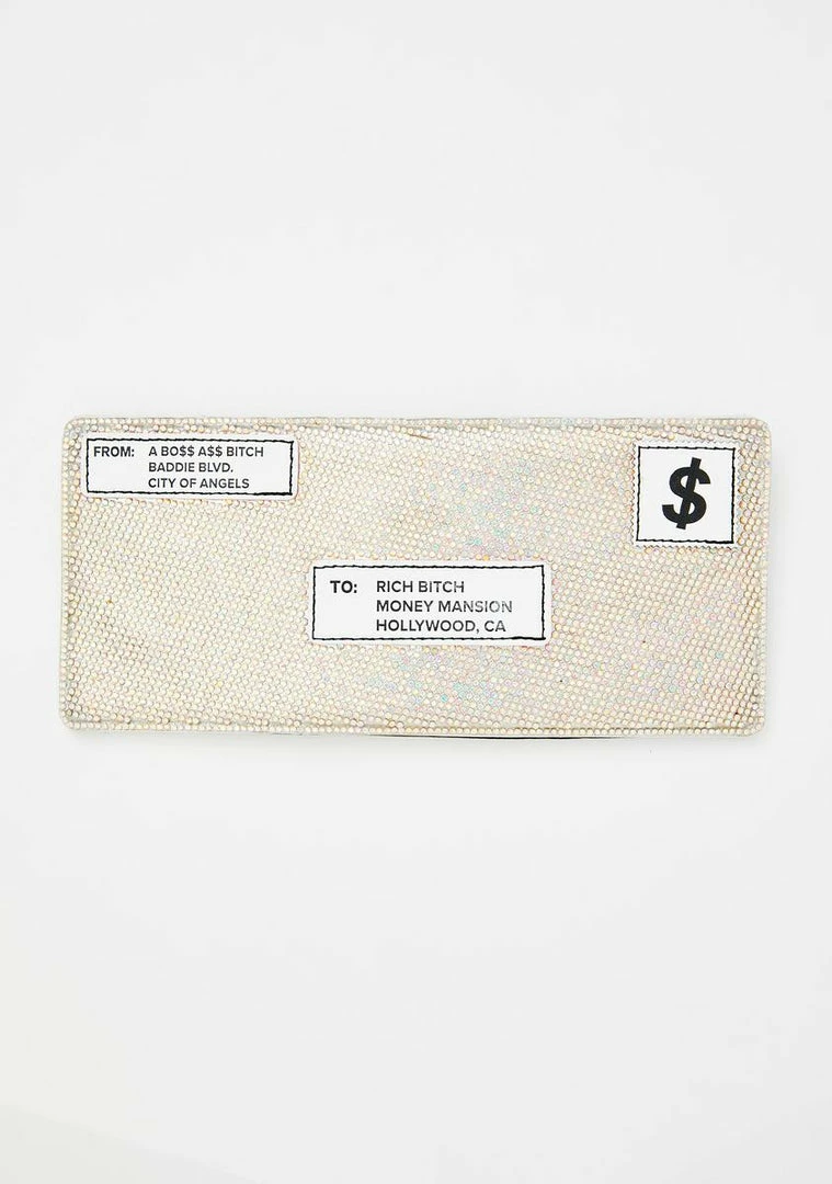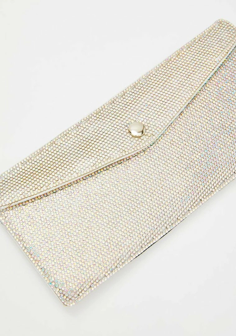 cuz bad bishes come in twos! They wanna know how ya do what you do in this spoiled brat clutch handbag that has an envelope construction, cha-ching iridescent rhinestones all ova, bo$$ embellishments on the front, N’ a back snap closure.