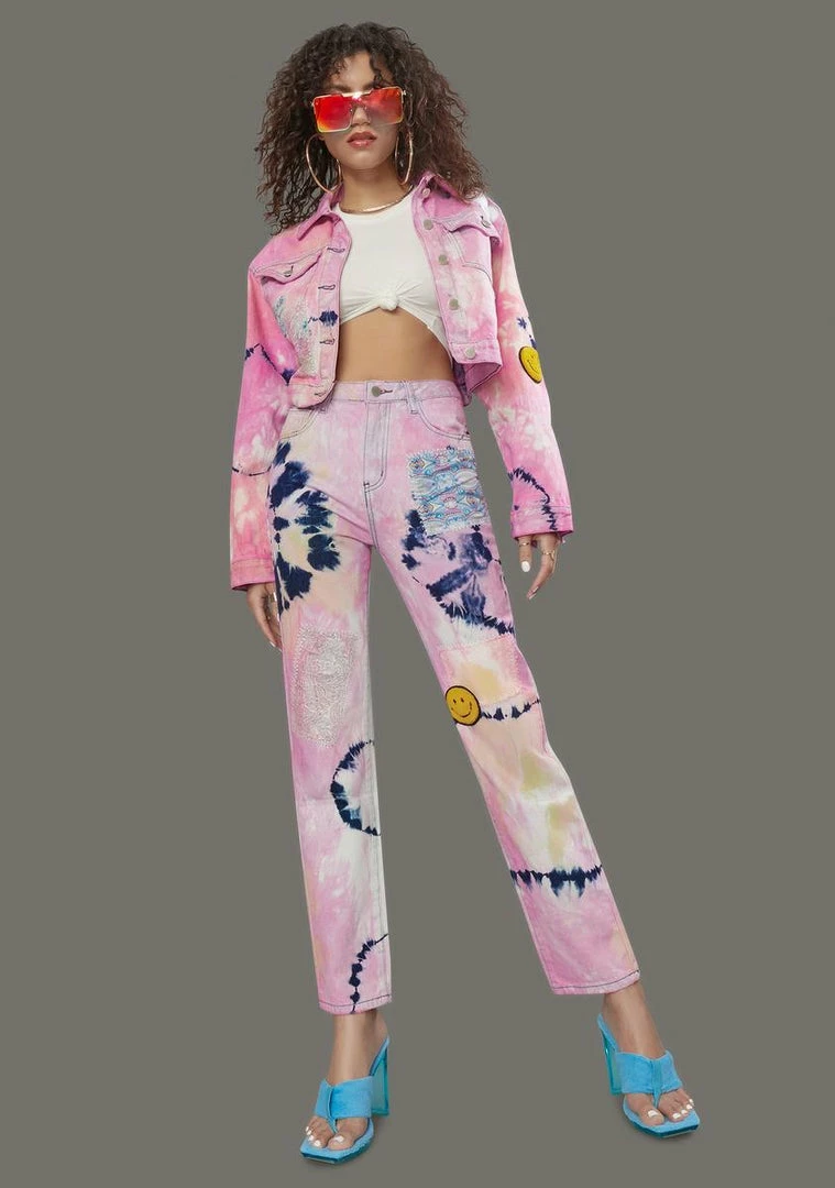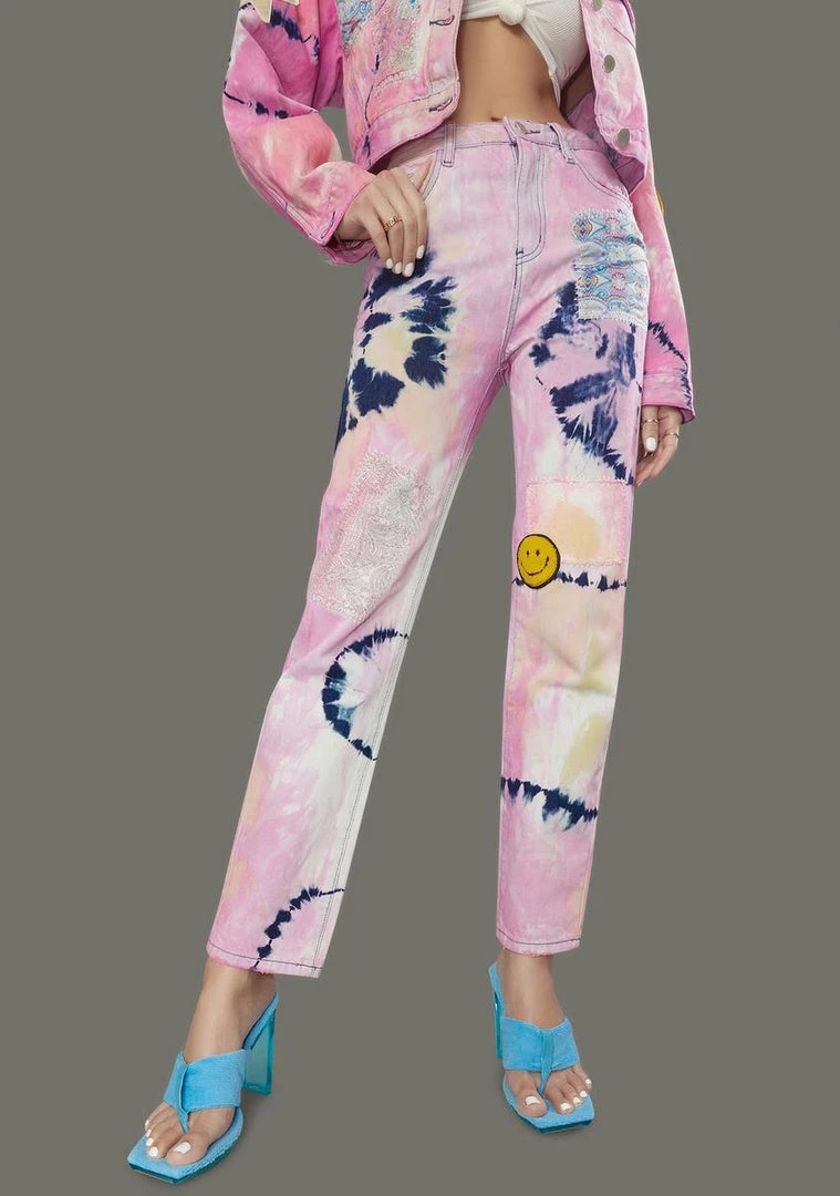 cuz this is a hypnotic harmony. These denim jeans feature a tie dye pattern all over, patched graphic details, a high waist fit, and pockets on the back.
