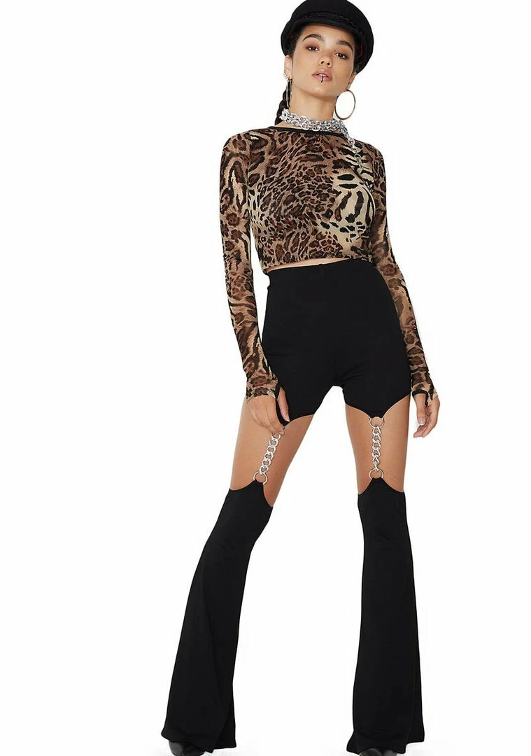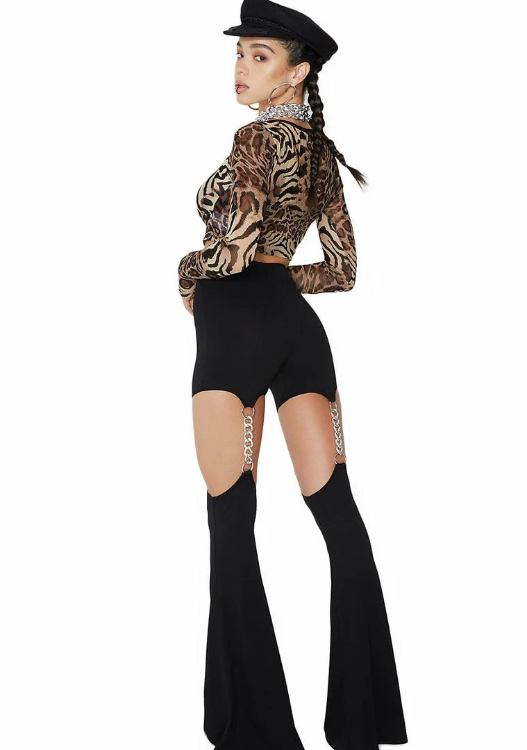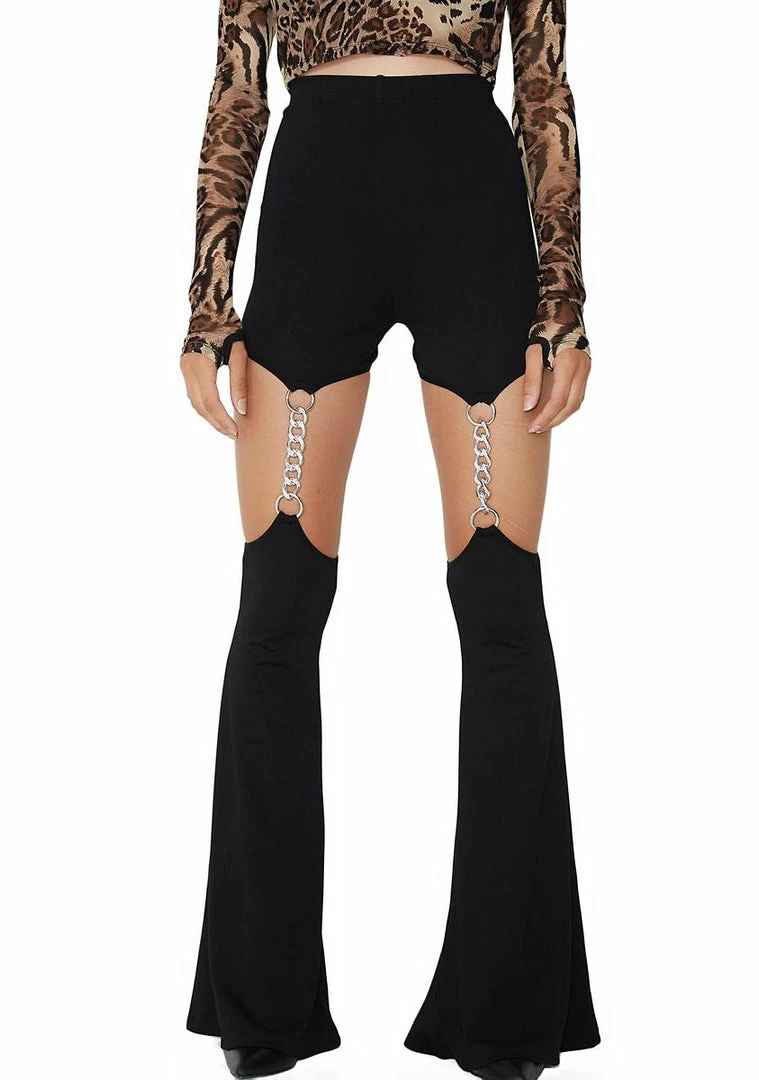cuz ur always the instigator, babe! These super sikk flares have a stretchy high-waist fit, cut-out legs with lightweight chain garters and an elastic waistband.