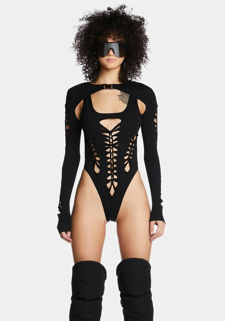 I’ll do what I want, when I want. This bodysuit set has a stretchy jersey construction and braided shredded cutouts all over. Includes a sleeveless high-cut bodysuit and a long sleeve shrug with a front buckle closure.