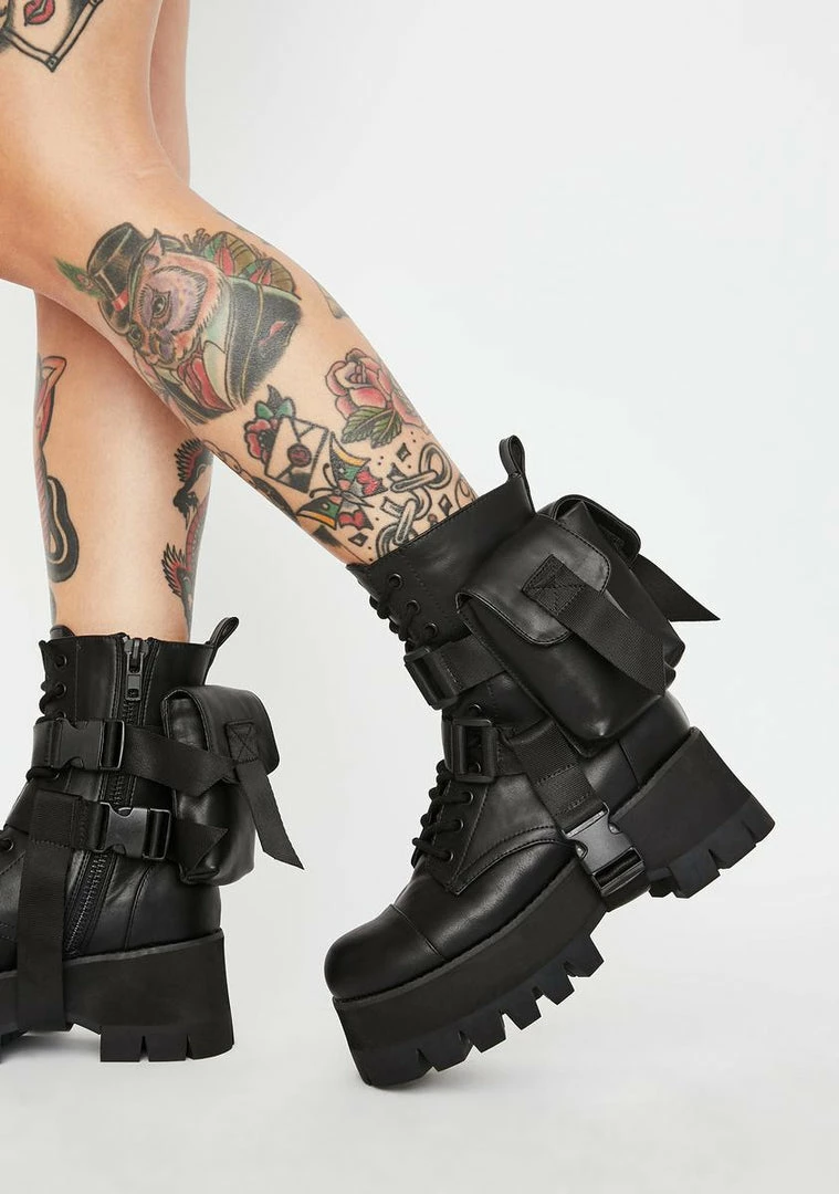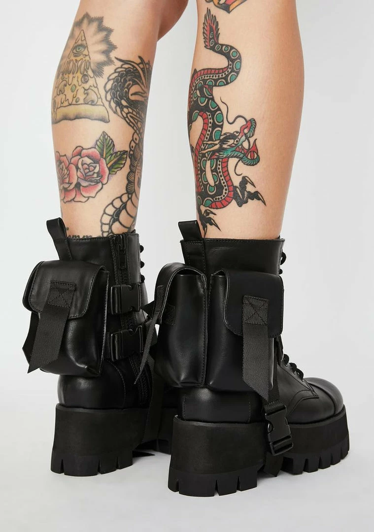 yer the word on the streetz. Call âem out bae Nâ tell âem to @ you in these chunky combat boots that have front lace up Nâ side zip closures, sikk detachable utility pockets Nâ platform treaded soles.