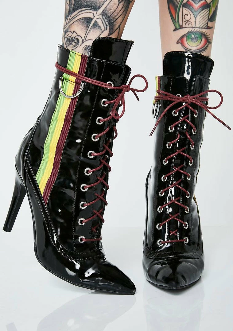 cuz ya tiptoe any Nâ everywhere. Try to keep it PG in these ca$h schmoney booties that have a shiny black patent design all ova, pointed toes, a multitone side stripe detail with D ring, and a lace-up Nâ zip closure to have ya feet on fleek all night bb.