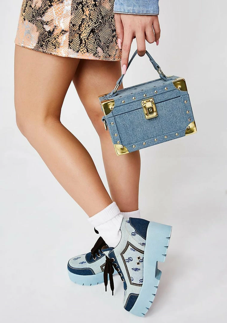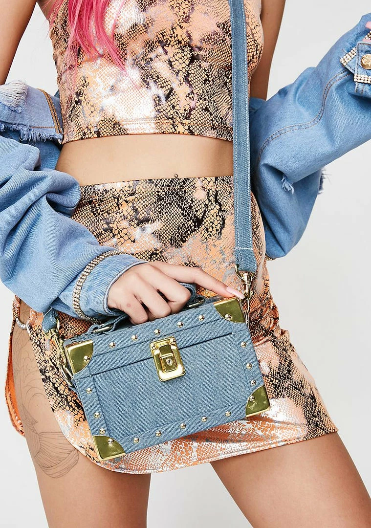 cuz everyone values you, bb. Keep ya goodz safe with this denim trunk bag that has gold hardware all ova, white contrast stitching all ova, an adjustable strap and a key closure.